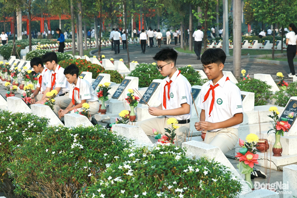 | Ảnh: Các em học sinh Trường TH-THCS-THPT song ngữ Lạc Hồng (phường Trấn Biên) thắp hương trên các phần mộ liệt sĩ |