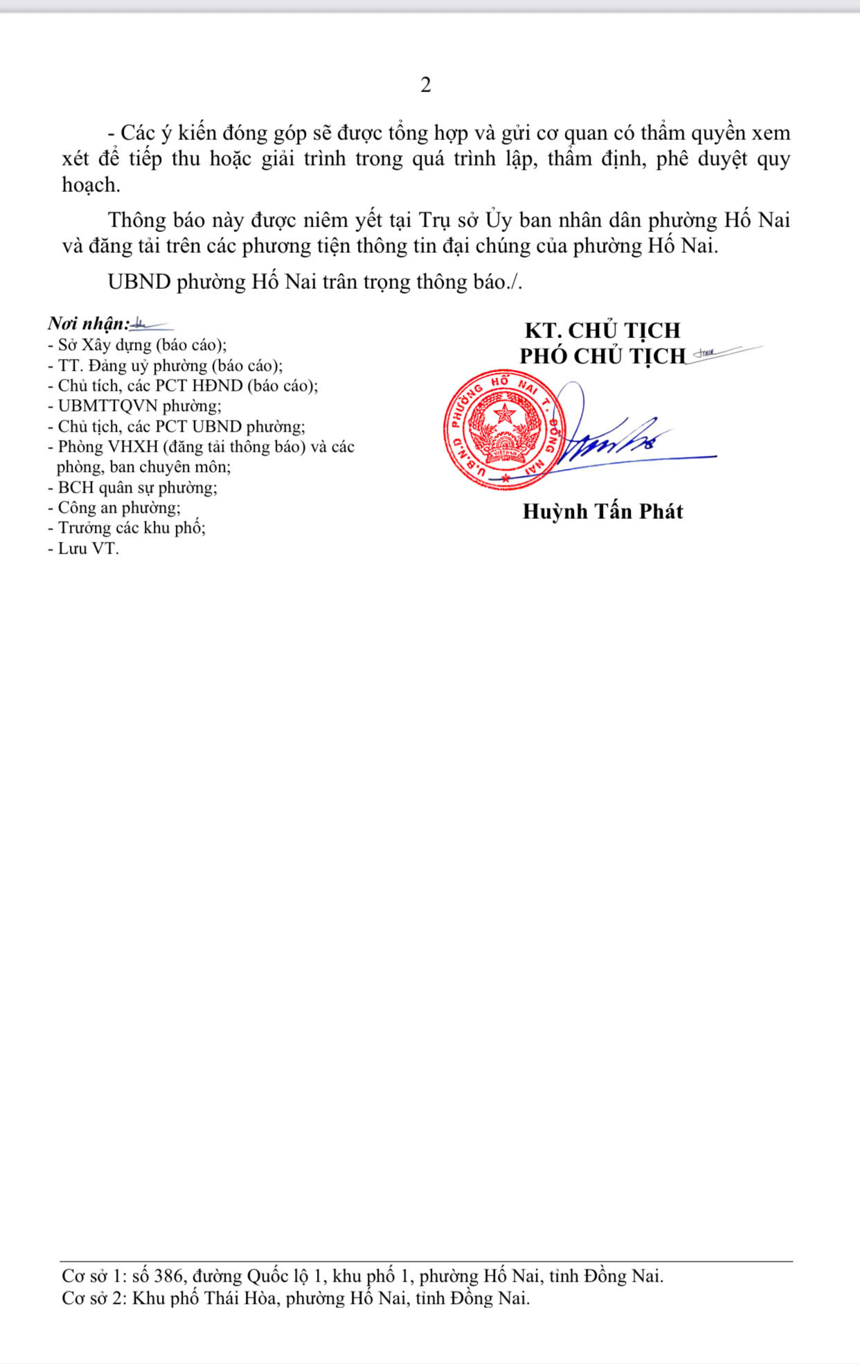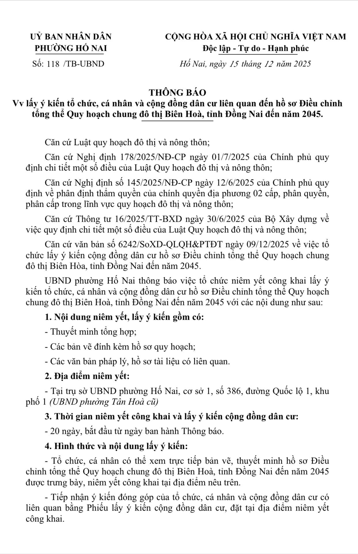 UBND phường Hố Nai thông báo việc tổ chức niêm yết công khai lấy ý kiến tổ chức, cá nhân và cộng đồng dân cư hồ sơ Điều chỉnh tổng thể Quy hoạch chung đô thị Biên Hoà, tỉnh Đồng Nai đến năm 2045.