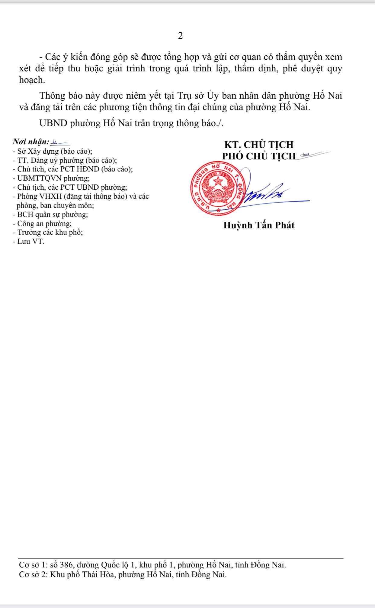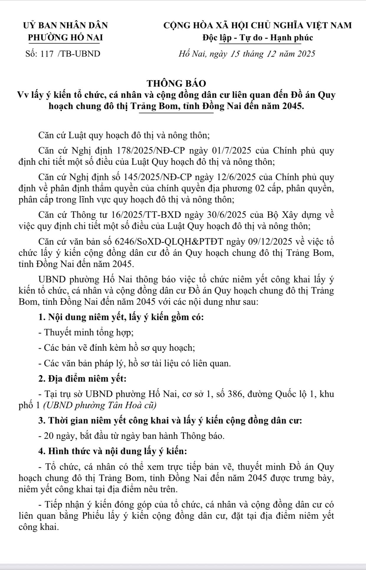 UBND phường Hố Nai thông báo việc tổ chức niêm yết công khai lấy ý kiến tổ chức, cá nhân và cộng đồng dân cư Đồ án Quy hoạch chung đô thị Trảng Bom, tỉnh Đồng Nai đến năm 2045.