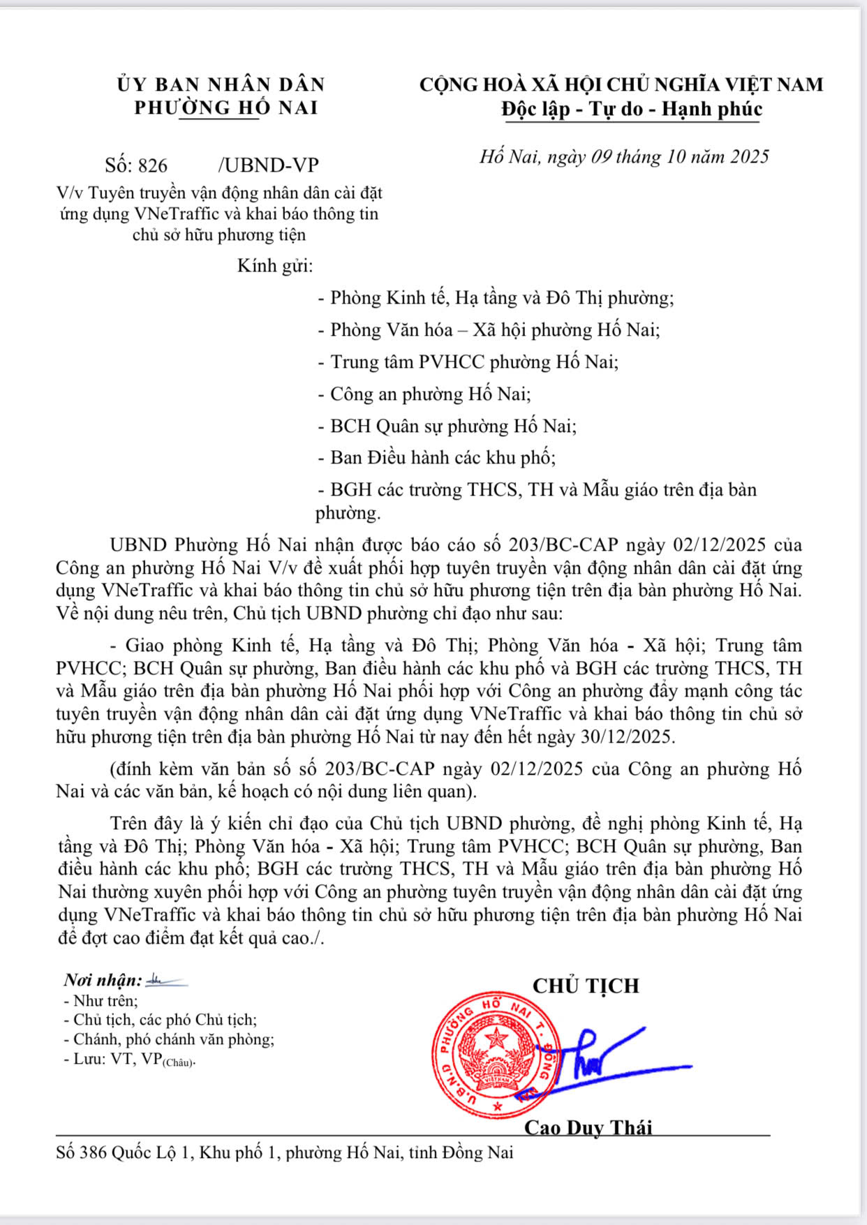 " UBND Phường Hố Nai tuyên truyền vận động nhân dân cài đặt ứng dụng VNeTraffic và khai báo thông tin chủ sở hữu phương tiện trên địa bàn phường Hố Nai "