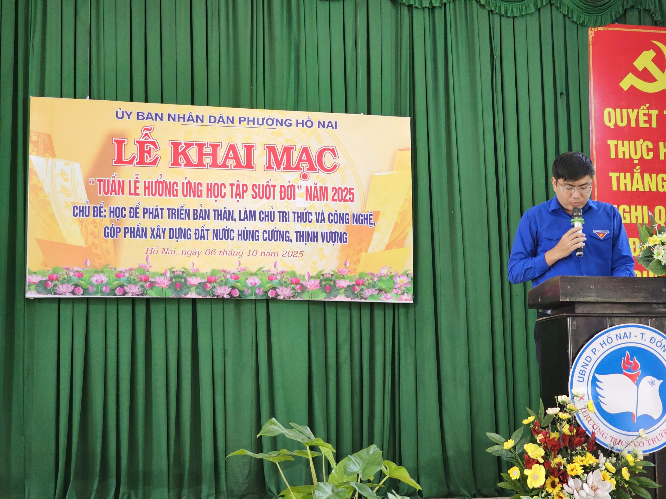 Tiếp đó, thay mặt tuổi trẻ phường Hố Nai, đồng chí Nguyễn Thế Anh – Bí thư Đoàn TNCS Hồ Chí Minh phường – đã phát biểu hưởng ứng phong trào. Đồng chí khẳng định: thanh niên Hố Nai sẽ tiên phong trong học tập, rèn luyện kỹ năng số, lan tỏa tinh thần học tập suốt đời đến từng đoàn viên, thanh thiếu niên và Nhân dân; biến “học tập suốt đời” thành hành động cụ thể – mỗi ngày một kiến thức mới, mỗi đoàn viên một việc làm tốt – góp phần xây dựng phường Hố Nai văn minh, hiện đại, nghĩa tình.