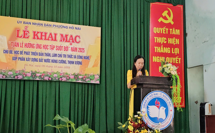 Phát biểu khai mạc buổi lễ, đồng chí Võ Thị Huỳnh Mai, Phó Chủ tịch UBND phường Hố Nai, nhấn mạnh: Việc học tập suốt đời là yêu cầu cấp thiết trong bối cảnh cách mạng công nghiệp 4.0 và chuyển đổi số đang diễn ra mạnh mẽ. Chủ đề năm 2025 mang thông điệp sâu sắc – “Học để phát triển bản thân, làm chủ tri thức và công nghệ, góp phần xây dựng đất nước hùng cường, thịnh vượng” – là kim chỉ nam để mỗi người dân Hố Nai không ngừng học hỏi, rèn luyện, làm chủ tri thức và công nghệ, góp phần vào sự nghiệp xây dựng quê hương giàu đẹp, văn minh.