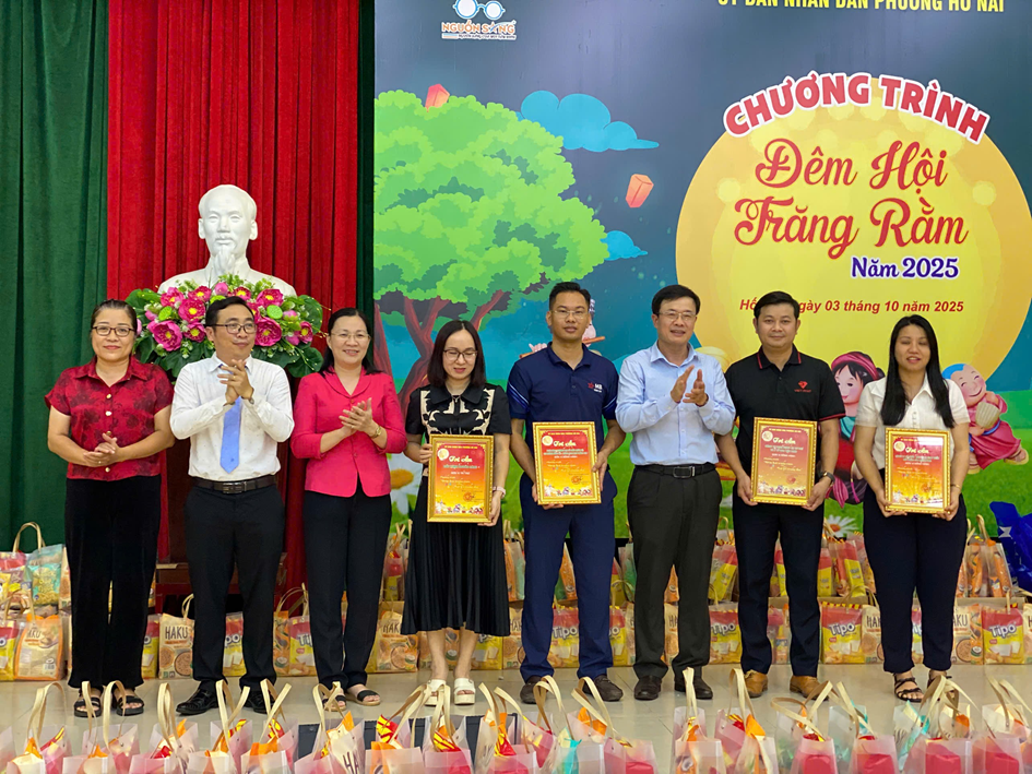 Các đồng chí Thường trực Đảng ủy – HĐND - UBND – UBMTTQ phường Hố Nai trao thư tri ân đến các đơn vị tài trợ trong đêm hội trăng rằm năm 2025