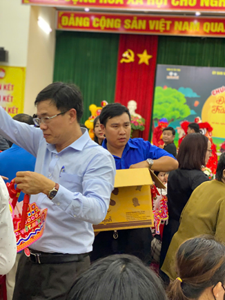 Đồng chí Nguyễn Quốc Vũ – Bí thư Đảng ủy; đồng chí Đỗ Thị Hòa Bình – Phó Bí thư Đảng ủy và đồng chí Cao Duy Thái – Phó bí thư Đảng ủy, CT UBND phường phát quà cho các em thiếu nhi. (thứ tự từ trái qua phải)